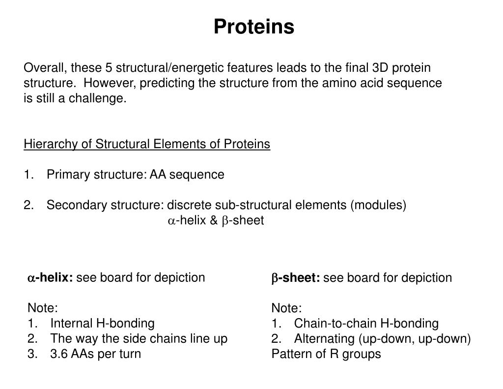 Proteins • Overall, these 5 structural/energetic features leads to the final 3D protein • structure. However, predicting the structure from the amino acid sequence • is still a challenge. • Hierarchy of Structural Elements of Proteins • Primary structure: AA sequence • Secondary structure: discrete sub-structural elements (modules) a-helix & b-sheet a-helix: see board for depiction Note: Internal H-bonding The way the side chains line up 3.6 AAs per turn b-sheet: see board for depiction Note: Chain-to-chain H-bonding Alternating (up-down, up-down) Pattern of R groups