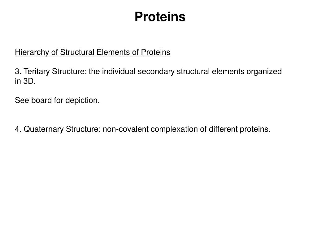 Proteins • Hierarchy of Structural Elements of Proteins 3. Teritary Structure: the individual secondary structural elements organized in 3D. See board for depiction. 4. Quaternary Structure: non-covalent complexation of different proteins.