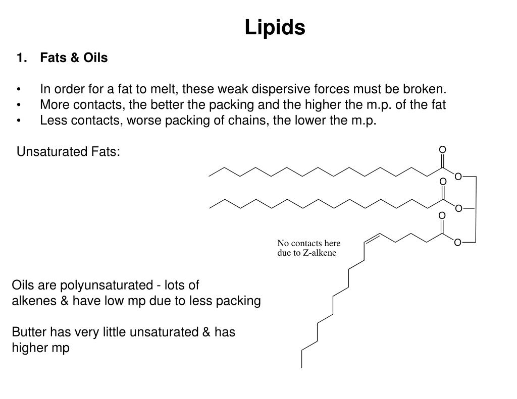 Lipids • Fats & Oils • In order for a fat to melt, these weak dispersive forces must be broken. • More contacts, the better the packing and the higher the m.p. of the fat • Less contacts, worse packing of chains, the lower the m.p. Unsaturated Fats: Oils are polyunsaturated - lots of alkenes & have low mp due to less packing Butter has very little unsaturated & has higher mp