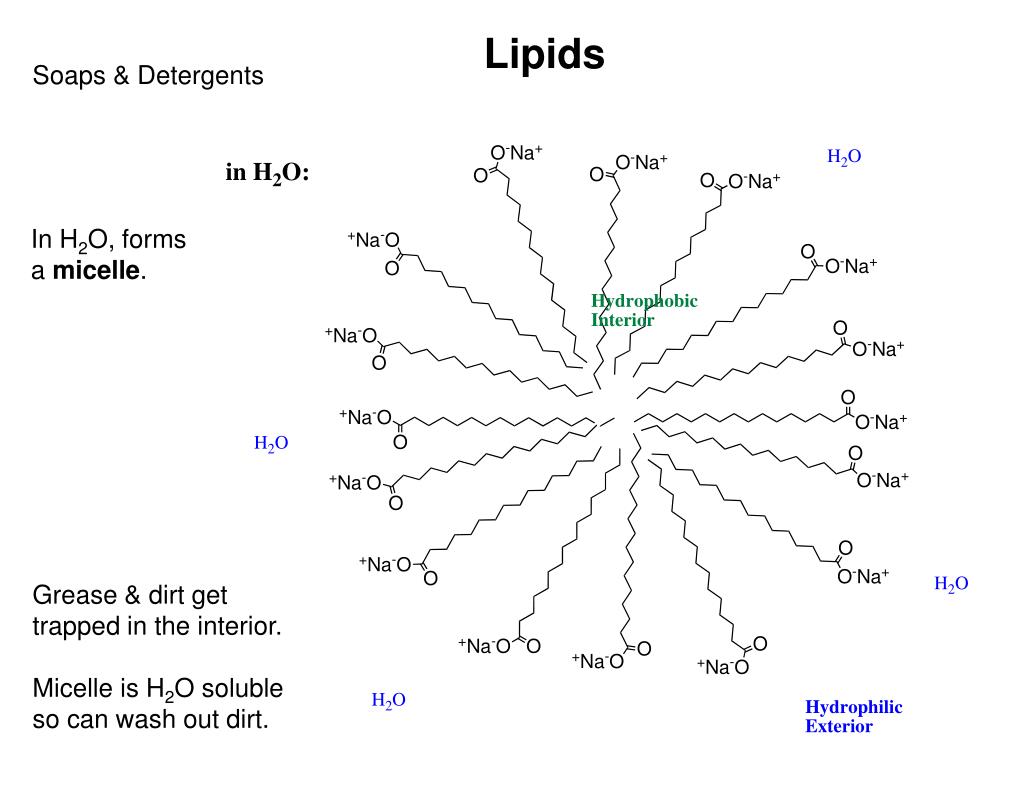 Lipids Soaps & Detergents In H2O, forms a micelle. Grease & dirt get trapped in the interior. Micelle is H2O soluble so can wash out dirt.