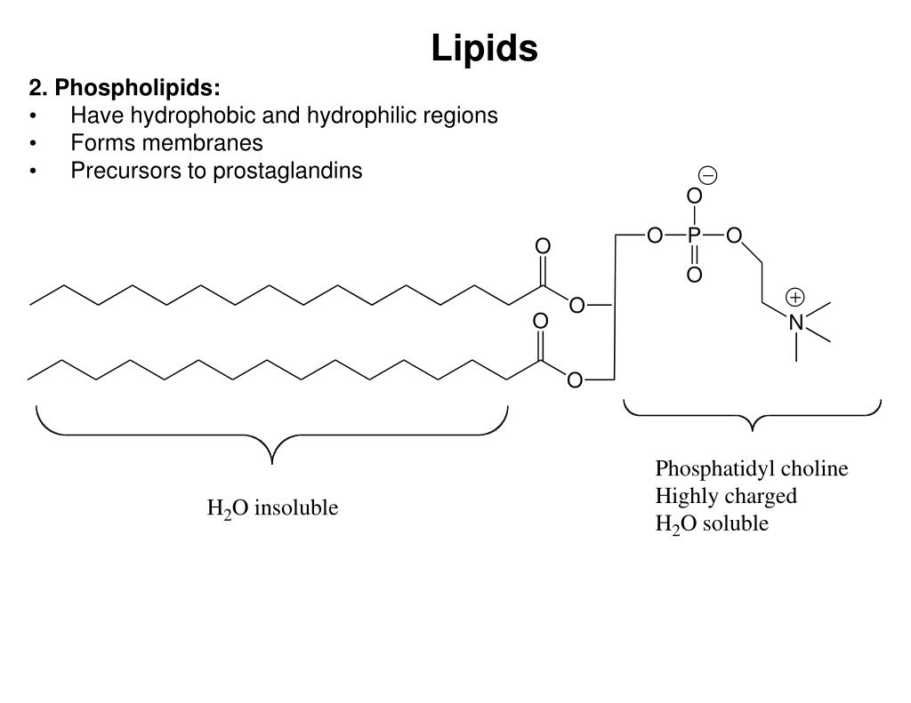 Lipids 2. Phospholipids: • Have hydrophobic and hydrophilic regions • Forms membranes • Precursors to prostaglandins