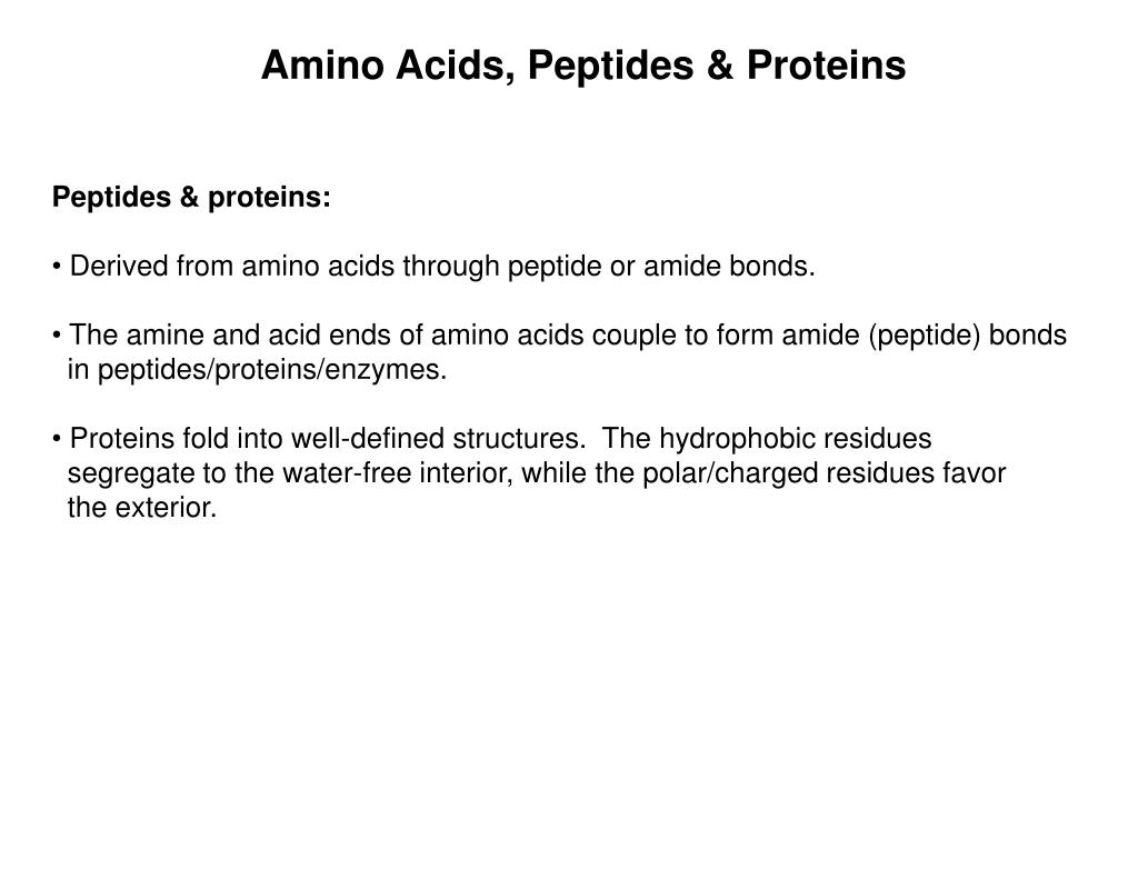 Amino Acids, Peptides & Proteins • Peptides & proteins: • Derived from amino acids through peptide or amide bonds. • The amine and acid ends of amino acids couple to form amide (peptide) bonds • in peptides/proteins/enzymes. • Proteins fold into well-defined structures. The hydrophobic residues • segregate to the water-free interior, while the polar/charged residues favor • the exterior.