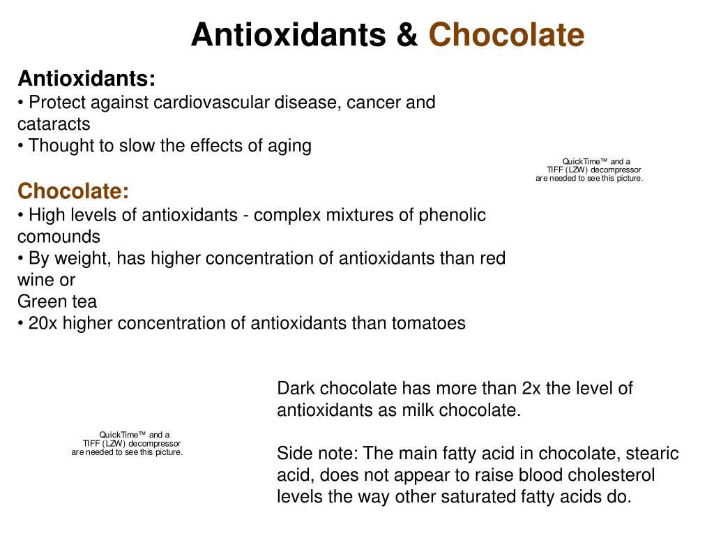 Antioxidants & Chocolate • Antioxidants: • Protect against cardiovascular disease, cancer and cataracts • Thought to slow the effects of aging • Chocolate: • High levels of antioxidants - complex mixtures of phenolic comounds • By weight, has higher concentration of antioxidants than red wine or • Green tea • 20x higher concentration of antioxidants than tomatoes Dark chocolate has more than 2x the level of antioxidants as milk chocolate. Side note: The main fatty acid in chocolate, stearic acid, does not appear to raise blood cholesterol levels the way other saturated fatty acids do.