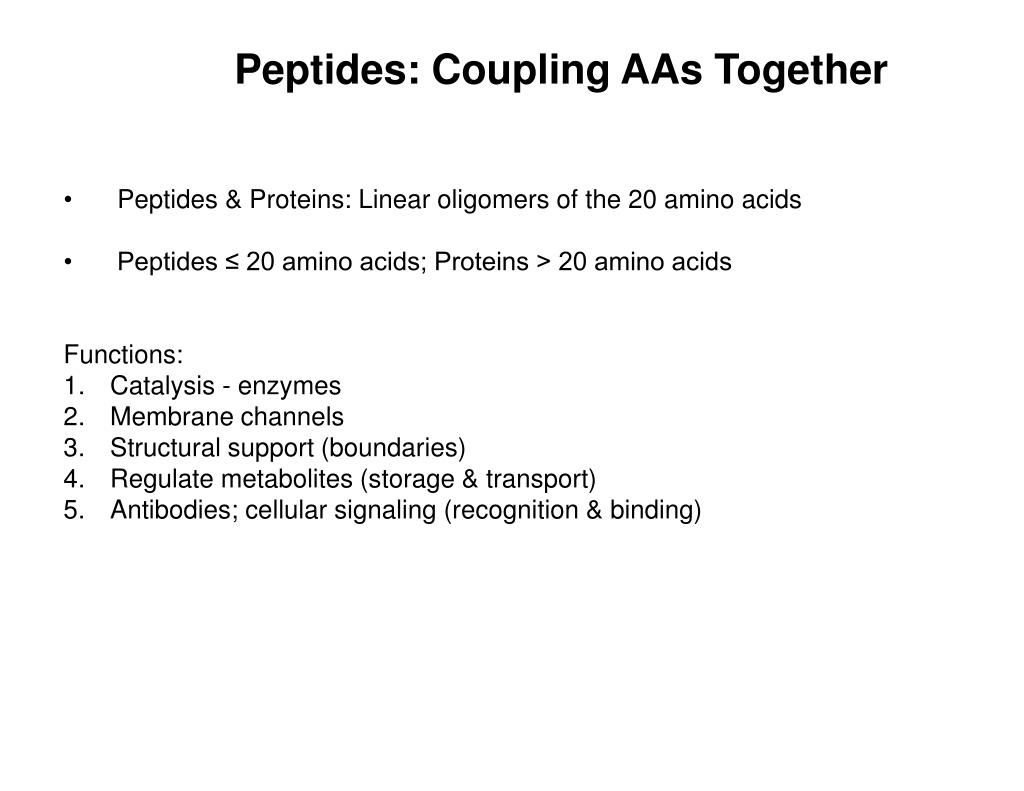 Peptides: Coupling AAs Together • Peptides & Proteins: Linear oligomers of the 20 amino acids • Peptides ≤ 20 amino acids; Proteins > 20 amino acids • Functions: • Catalysis - enzymes • Membrane channels • Structural support (boundaries) • Regulate metabolites (storage & transport) • Antibodies; cellular signaling (recognition & binding)