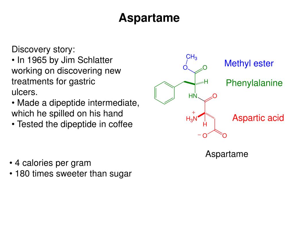 Aspartame • Discovery story: • In 1965 by Jim Schlatter • working on discovering new • treatments for gastric • ulcers. • Made a dipeptide intermediate, • which he spilled on his hand • Tested the dipeptide in coffee Aspartame • 4 calories per gram • 180 times sweeter than sugar