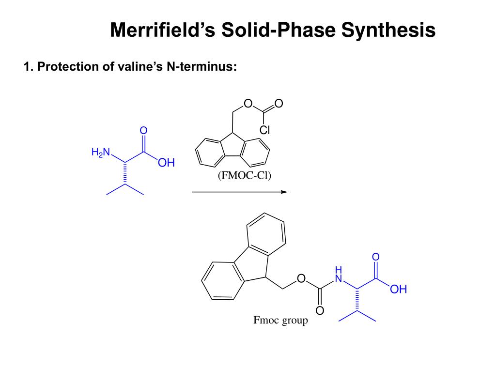 Merrifield’s Solid-Phase Synthesis In order to get the desired peptide (val-ala), the appropriate NH2 and CO2 units must be joined. The selectivity is accomplished through the use of protecting groups. Merrifield’s approach: Protect N-terminus of valine Protect C-terminus of alanine Couple valine and alanine Deprotect to get dipeptide