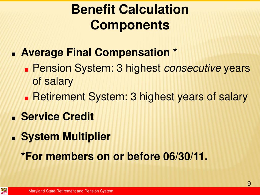 Benefit Calculation Components • Average Final Compensation * • Pension System: 3 highest consecutive years of salary • Retirement System: 3 highest years of salary • Service Credit • System Multiplier *For members on or before 06/30/11.