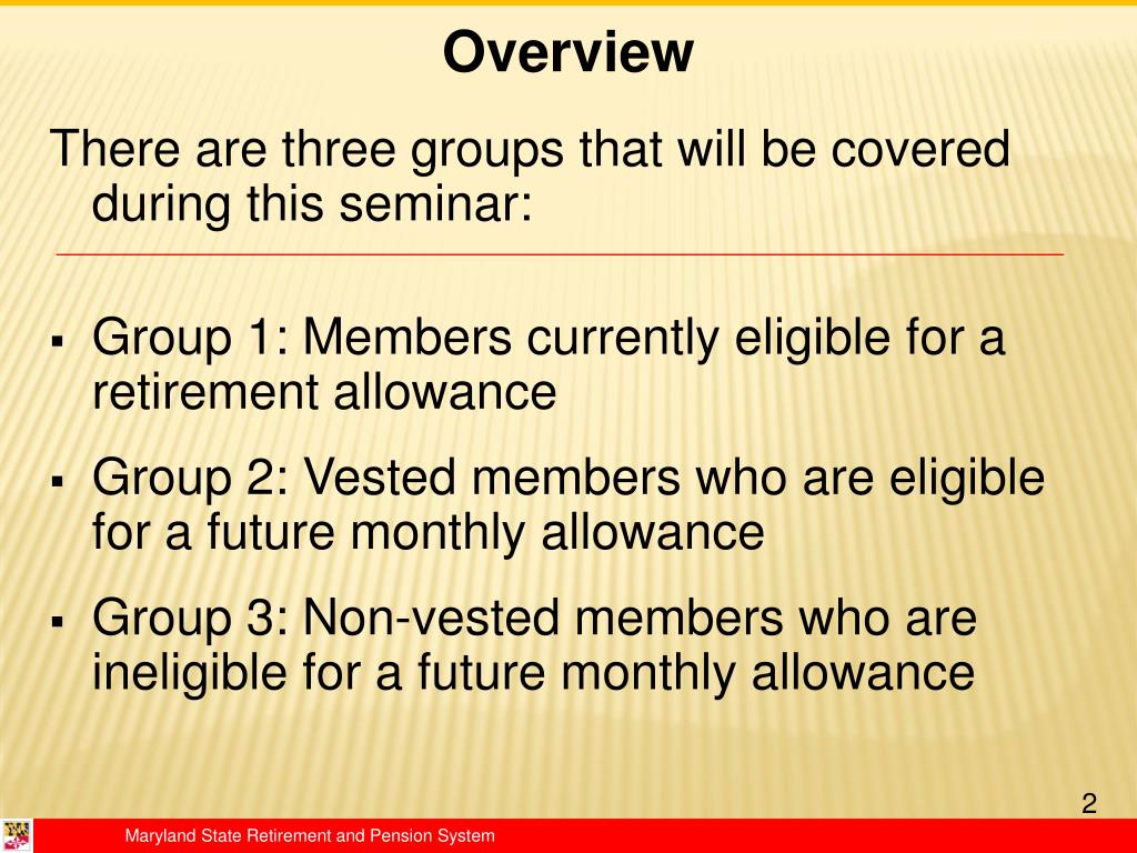 Overview There are three groups that will be covered during this seminar: • Group 1: Members currently eligible for a retirement allowance • Group 2: Vested members who are eligible for a future monthly allowance • Group 3: Non-vested members who are ineligible for a future monthly allowance