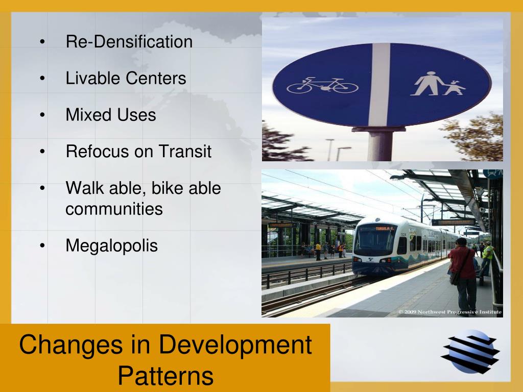Re-Densification • Livable Centers • Mixed Uses • Refocus on Transit • Walk able, bike able communities • Megalopolis Changes in Development Patterns