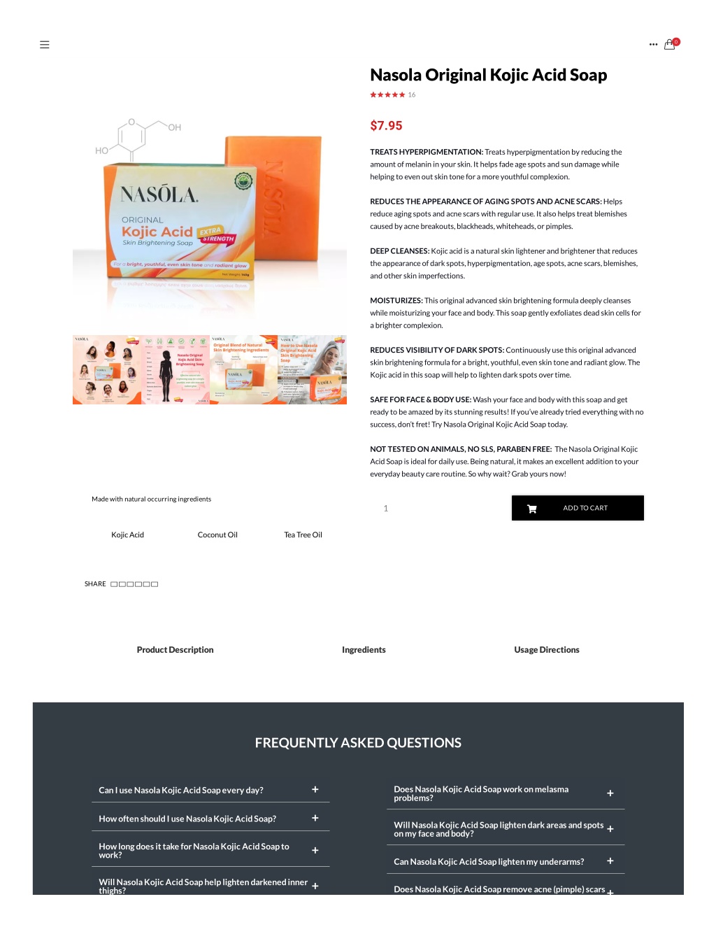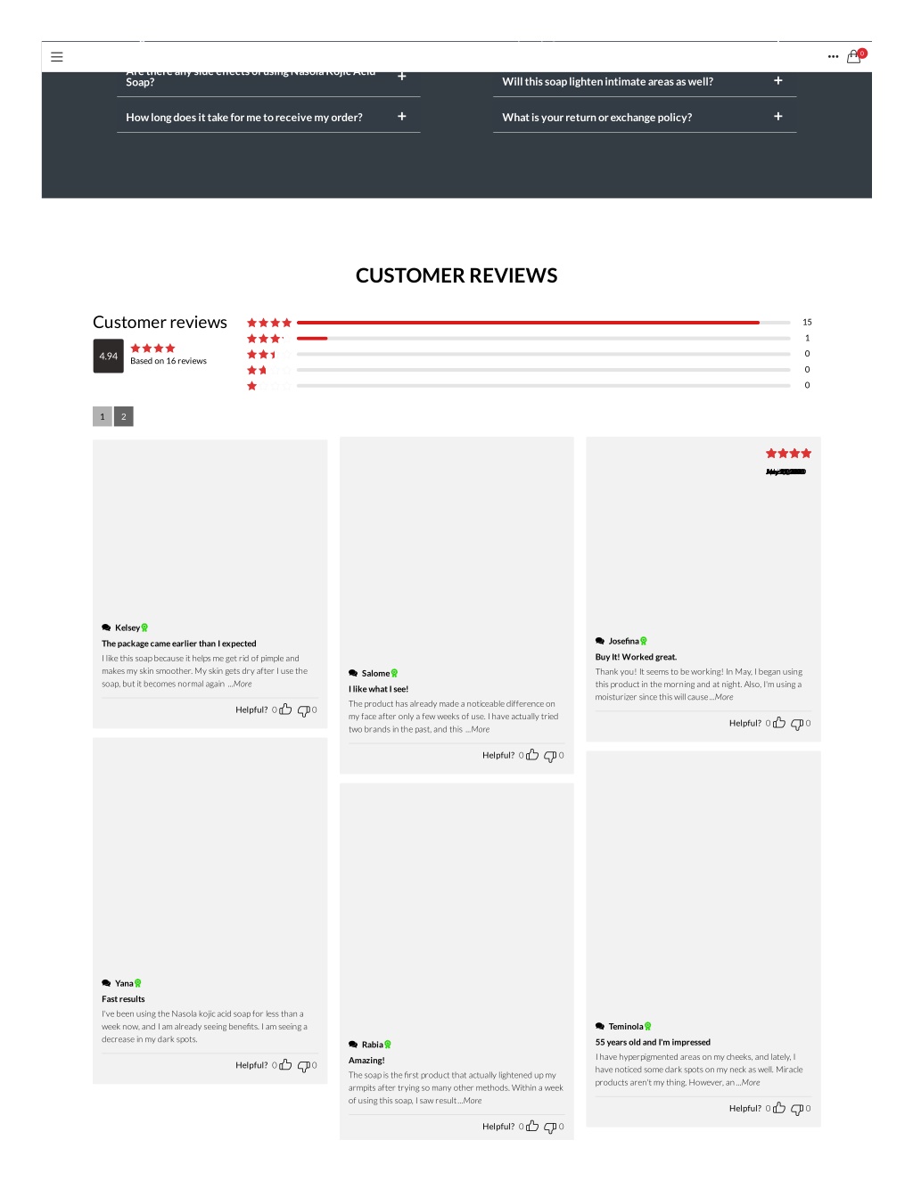 g and marks? 0 Are there any side effects of using Nasola Kojic Acid Soap? Will this soap lighten intimate areas as well? How long does it take for me to receive my order? What is your return or exchange policy? CUSTOMER REVIEWS Customer reviews 15 ssss SSSS 1 ssss SSSS ssss SSSS 0 ssss SSS 4.94 Based on 16 reviews 0 ssss SS 0 ssss S 1 2 ssss SSSS ssss SSSS ssss SSSS ssss SSSS ssss SSSS ssss SSSS ssss SSSS ssss SSSS ssss SSSS ssss SSSS ssss SSSS ssss SSSS July 21, 2020 July 17, 2020 July 5, 2020 June 29, 2020 June 11, 2020 June 1, 2020 May 21, 2020 May 19, 2020 May 13, 2020 May 9, 2020 May 4, 2020 April 30, 2020 Kelsey Jose?na The package came earlier than I expected Buy It! Worked great. I like this soap because it helps me get rid of pimple and makes my skin smoother. My skin gets dry after I use the soap, but it becomes normal again ...More Thank you! It seems to be working! In May, I began using this product in the morning and at night. Also, I'm using a moisturizer since this will cause...More Salome I like what I see! The product has already made a noticeable difference on my face after only a few weeks of use. I have actually tried two brands in the past, and this ...More Helpful? 0 0 Helpful? 0 0 Helpful? 0 0 Yana Fast results I've been using the Nasola kojic acid soap for less than a week now, and I am already seeing bene?ts. I am seeing a decrease in my dark spots. Teminola 55 years old and I'm impressed Rabia I have hyperpigmented areas on my cheeks, and lately, I have noticed some dark spots on my neck as well. Miracle products aren't my thing. However, an...More Amazing! Helpful? 0 0 The soap is the ?rst product that actually lightened up my armpits after trying so many other methods. Within a week of using this soap, I saw result...More Helpful? 0 0 Helpful? 0 0