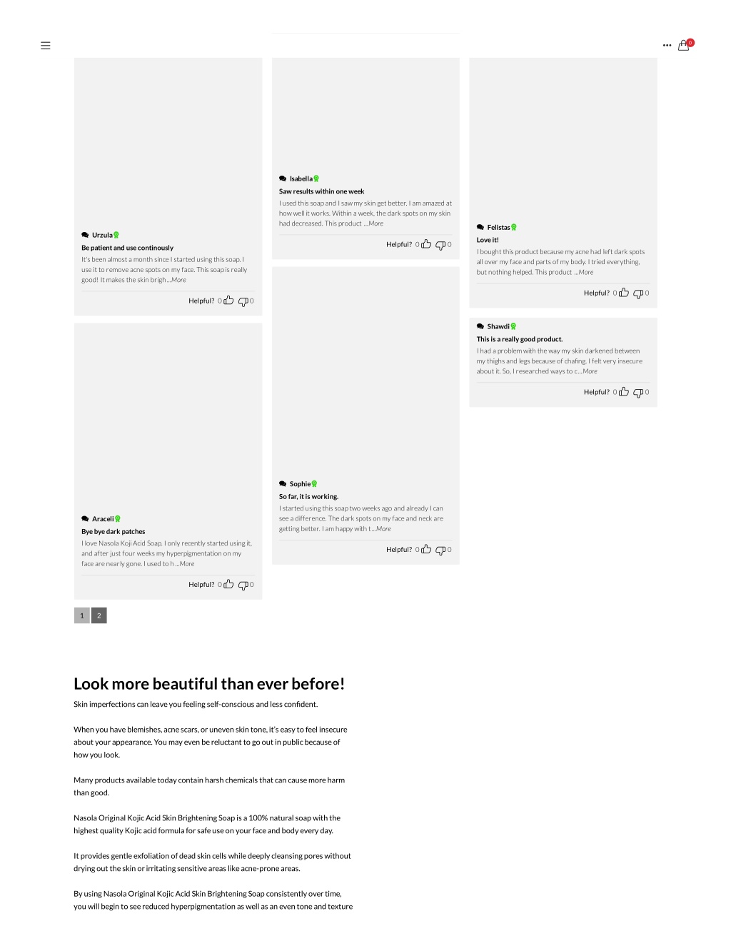 0 Isabella Saw results within one week I used this soap and I saw my skin get better. I am amazed at how well it works. Within a week, the dark spots on my skin had decreased. This product ...More Felistas Urzula Love it! Helpful? 0 0 Be patient and use continously I bought this product because my acne had left dark spots all over my face and parts of my body. I tried everything, but nothing helped. This product ...More It's been almost a month since I started using this soap. I use it to remove acne spots on my face. This soap is really good! It makes the skin brigh...More Helpful? 0 0 Helpful? 0 0 Shawdi This is a really good product. I had a problem with the way my skin darkened between my thighs and legs because of cha?ng. I felt very insecure about it. So, I researched ways to c...More Helpful? 0 0 Sophie So far, it is working. I started using this soap two weeks ago and already I can see a difference. The dark spots on my face and neck are getting better. I am happy with t...More Araceli Bye bye dark patches I love Nasola Koji Acid Soap. I only recently started using it, and after just four weeks my hyperpigmentation on my face are nearly gone. I used to h...More Helpful? 0 0 Helpful? 0 0 1 2 Look more beautiful than ever before! Skin imperfections can leave you feeling self-conscious and less con?dent. When you have blemishes, acne scars, or uneven skin tone, it’s easy to feel insecure about your appearance. You may even be reluctant to go out in public because of how you look. Many products available today contain harsh chemicals that can cause more harm than good. Nasola Original Kojic Acid Skin Brightening Soap is a 100% natural soap with the highest quality Kojic acid formula for safe use on your face and body every day. It provides gentle exfoliation of dead skin cells while deeply cleansing pores without drying out the skin or irritating sensitive areas like acne-prone areas. By using Nasola Original Kojic Acid Skin Brightening Soap consistently over time, you will begin to see reduced hyperpigmentation as well as an even tone and texture