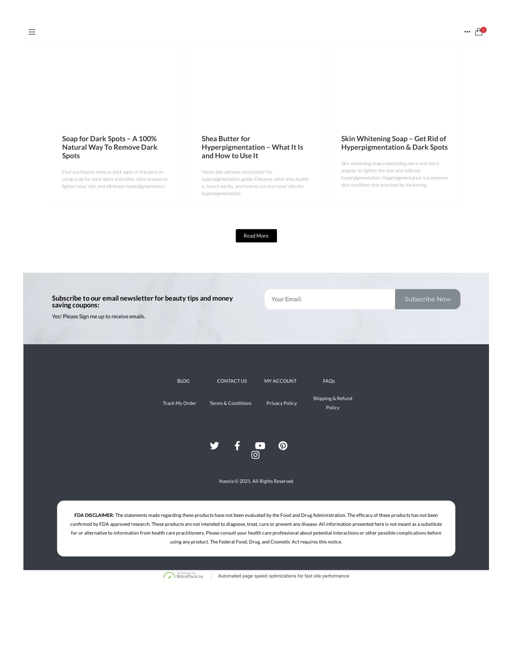 0 Soap for Dark Spots – A 100% Natural Way To Remove Dark Spots Shea Butter for Hyperpigmentation – What It Is and How to Use It Skin Whitening Soap – Get Rid of Hyperpigmentation & Dark Spots Skin whitening soap is becoming more and more popular to lighten the skin and address hyperpigmentation. Hyperpigmentation is a common skin condition characterized by darkening Find out how to remove dark spots in this post on using soap for dark spots and other natural ways to lighten your skin and eliminate hyperpigmentation. Here’s the ultimate shea butter for hyperpigmentation guide. Discover what shea butter is, how it works, and how to use it on your skin for hyperpigmentation. Read More Subscribe to our email newsletter for beauty tips and money saving coupons: Your Email: Subscribe Now Yes! Please Sign me up to receive emails. FAQs BLOG CONTACT US MY ACCOUNT Shipping & Refund Track My Order Terms & Conditions Privacy Policy Policy Nasola © 2021. All Rights Reserved FDA DISCLAIMER: The statements made regarding these products have not been evaluated by the Food and Drug Administration. The ef?cacy of these products has not been con?rmed by FDA approved research. These products are not intended to diagnose, treat, cure or prevent any disease. All information presented here is not meant as a substitute for or alternative to information from health care practitioners. Please consult your health care professional about potential interactions or other possible complications before using any product. The Federal Food, Drug, and Cosmetic Act requires this notice. Automated page speed optimizations for fast site performance