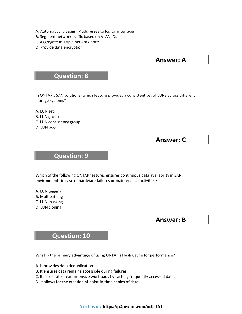 A. Automatically assign IP addresses to logical interfaces B. Segment network traffic based on VLAN IDs C. Aggregate multiple network ports D. Provide data encryption Answer: A Question: 8 In ONTAP's SAN solutions, which feature provides a consistent set of LUNs across different storage systems? A. LUN set B. LUN group C. LUN consistency group D. LUN pool Answer: C Question: 9 Which of the following ONTAP features ensures continuous data availability in SAN environments in case of hardware failures or maintenance activities? A. LUN tagging B. Multipathing C. LUN masking D. LUN cloning Answer: B Question: 10 What is the primary advantage of using ONTAP's Flash Cache for performance? A. It provides data deduplication. B. It ensures data remains accessible during failures. C. It accelerates read-intensive workloads by caching frequently accessed data. D. It allows for the creation of point-in-time copies of data. Visit us at: https://p2pexam.com/ns0-164