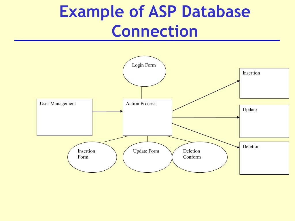 Login Form Insertion User Management Action Process Update Insertion Form Update Form Deletion Conform Deletion Example of ASP Database Connection