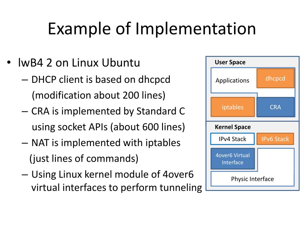 Example of Implementation • lwB4 2 on Linux Ubuntu • DHCP client is based on dhcpcd (modification about 200 lines) • CRA is implemented by Standard C using socket APIs (about 600 lines) • NAT is implemented with iptables (just lines of commands) • Using Linux kernel module of 4over6 virtual interfaces to perform tunneling User Space Applications dhcpcd iptables CRA Kernel Space IPv4 Stack IPv6 Stack 4over6 Virtual Interface Physic Interface