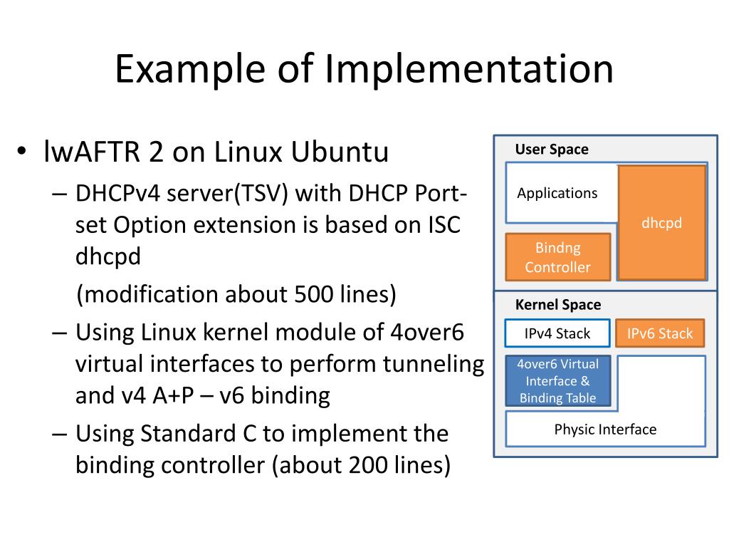 Example of Implementation • lwAFTR 2 on Linux Ubuntu • DHCPv4 server(TSV) with DHCP Port-set Option extension is based on ISC dhcpd (modification about 500 lines) • Using Linux kernel module of 4over6 virtual interfaces to perform tunneling and v4 A+P – v6 binding • Using Standard C to implement the binding controller (about 200 lines) User Space Applications dhcpd Bindng Controller Kernel Space IPv4 Stack IPv6 Stack 4over6 Virtual Interface & Binding Table Physic Interface