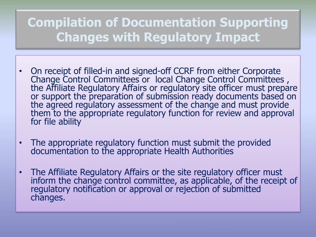 Compilation of Documentation SupportingChanges with Regulatory Impact • On receipt of filled-in and signed-off CCRF from either Corporate Change Control Committees or local Change Control Committees , the Affiliate Regulatory Affairs or regulatory site officer must prepare or support the preparation of submission ready documents based on the agreed regulatory assessment of the change and must provide them to the appropriate regulatory function for review and approval for file ability • The appropriate regulatory function must submit the provided documentation to the appropriate Health Authorities • The Affiliate Regulatory Affairs or the site regulatory officer must inform the change control committee, as applicable, of the receipt of regulatory notification or approval or rejection of submitted changes.