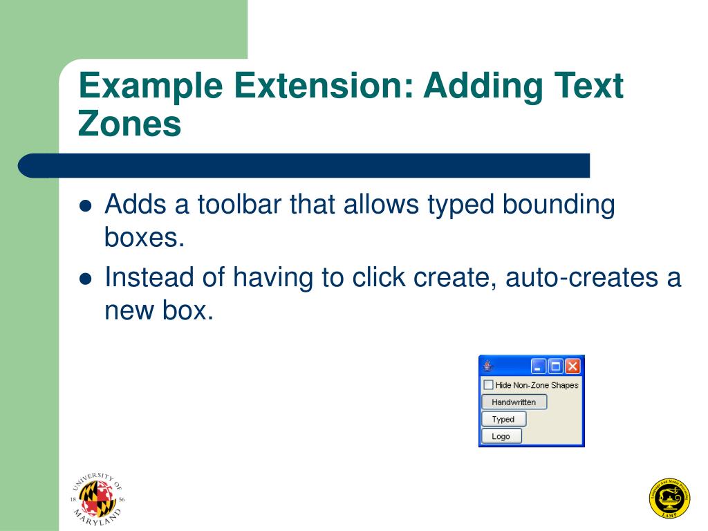 Example Extension: Adding Text Zones • Adds a toolbar that allows typed bounding boxes. • Instead of having to click create, auto-creates a new box.