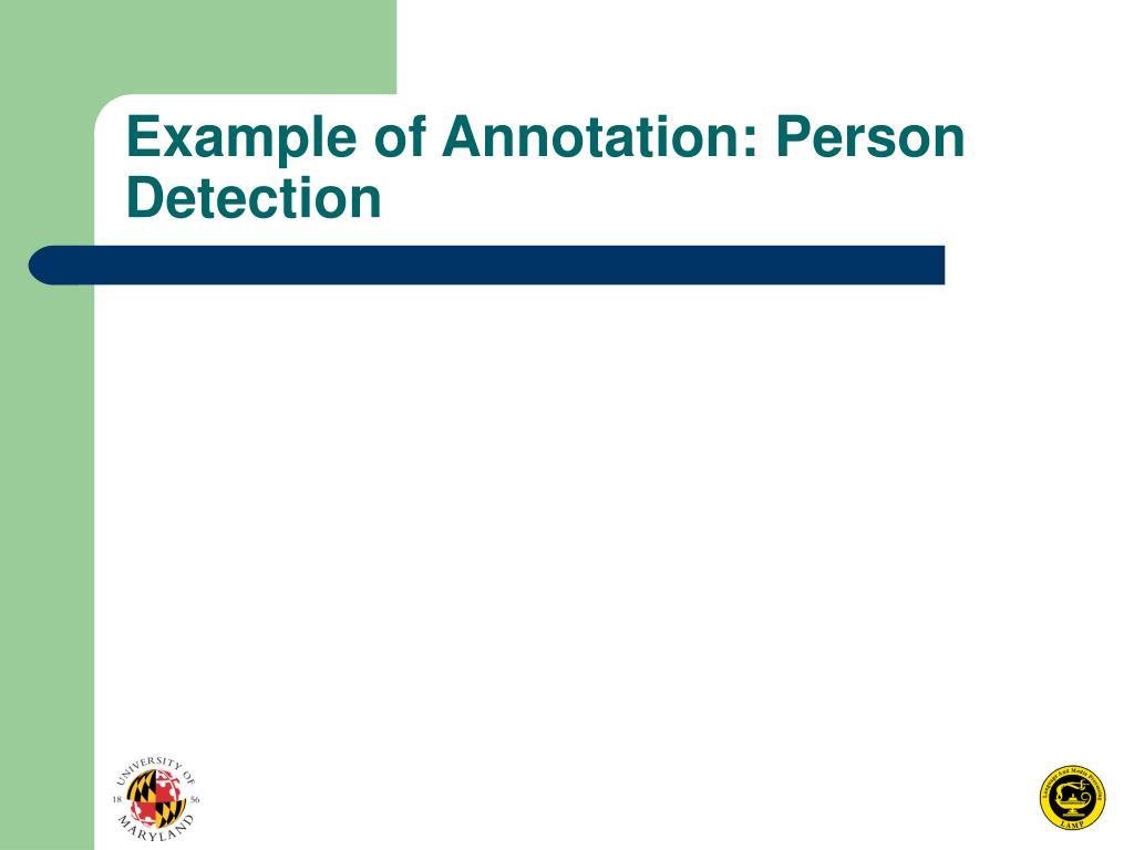 For Example: Person Tracking • How well does an algorithm find and track humans moving through a video? • To evaluate detection: • Truth must indicate which frames contain the person. • To evaluate tracking: • Truth must contain spatial information, indicating where a person may be found.
