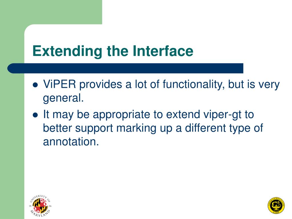Extending the Interface • ViPER provides a lot of functionality, but is very general. • It may be appropriate to extend viper-gt to better support marking up a different type of annotation.