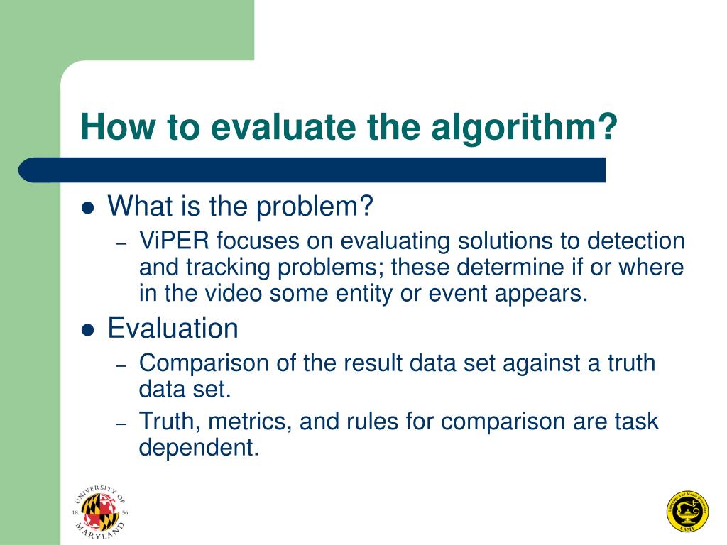 How to evaluate the algorithm? • What is the problem? • ViPER focuses on evaluating solutions to detection and tracking problems; these determine if or where in the video some entity or event appears. • Evaluation • Comparison of the result data set against a truth data set. • Truth, metrics, and rules for comparison are task dependent.