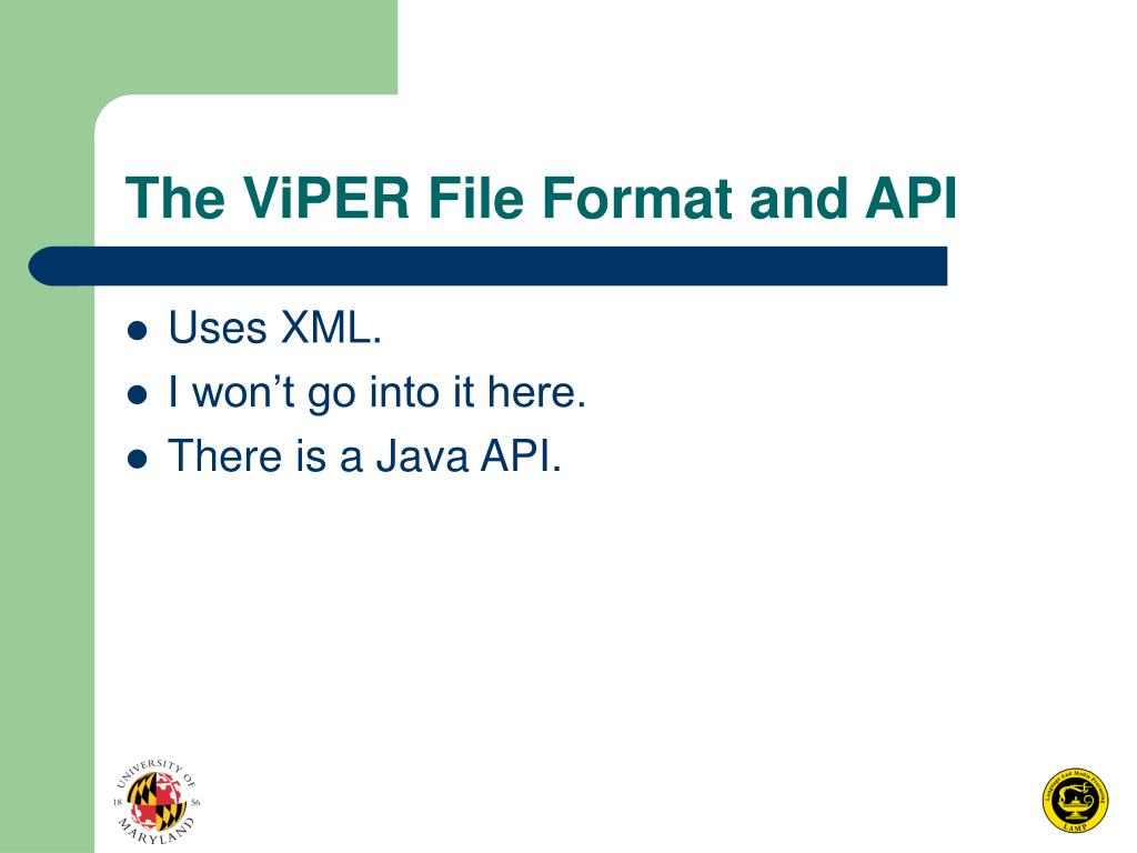 The ViPER File Format and API • Uses XML. • I won’t go into it here. • There is a Java API.