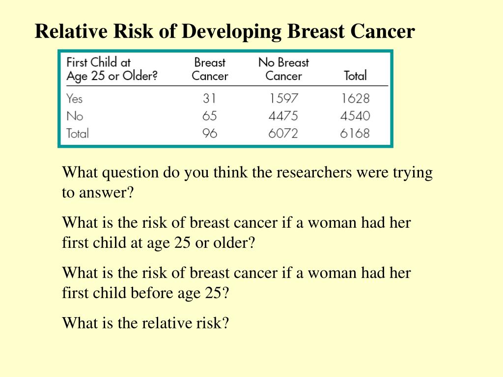 Relative Risk of Developing Breast Cancer What question do you think the researchers were trying to answer? What is the risk of breast cancer if a woman had her first child at age 25 or older? What is the risk of breast cancer if a woman had her first child before age 25? What is the relative risk?