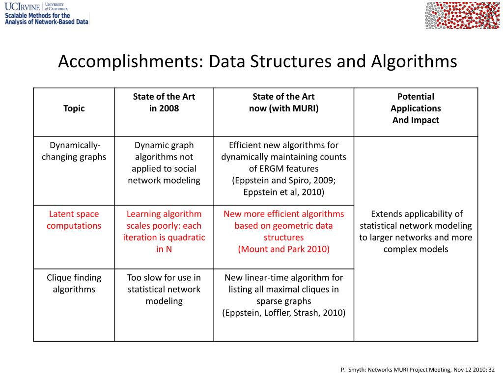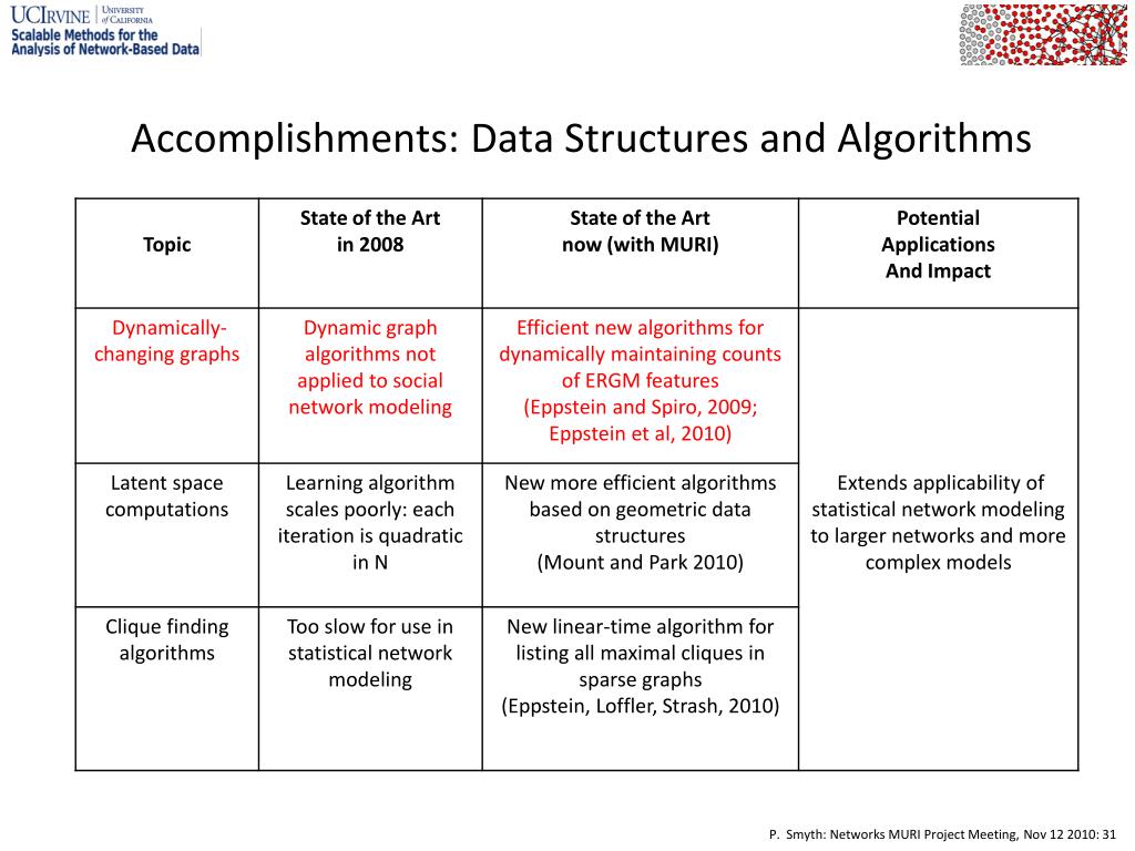 …..and the Old Generation • Carter Butts • American Sociological Association, Leo A. Goodman award, 2010 • highest award to young methodological researchers in social science • Michael Goodrich • ACM Fellow, IEEE Fellow, 2009 • Padhraic Smyth • ACM SIGKDD Innovation Award 2009 • AAAI Fellow 2010 • Mark Handcock • Fellow of the American Statistical Association, 2009