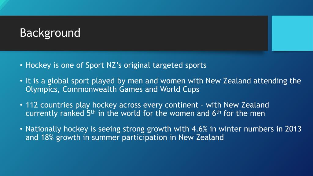 Background • Hockey is one of Sport NZ’s original targeted sports • It is a global sport played by men and women with New Zealand attending the Olympics, Commonwealth Games and World Cups • 112 countries play hockey across every continent – with New Zealand currently ranked 5th in the world for the women and 6th for the men • Nationally hockey is seeing strong growth with 4.6% in winter numbers in 2013 and 18% growth in summer participation in New Zealand