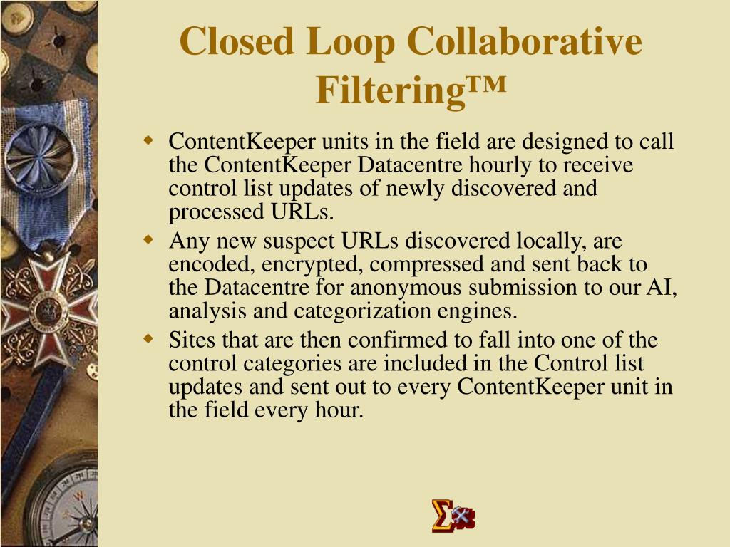 Closed Loop Collaborative Filtering™ • Closed Loop Collaborative Filtering is ContentKeeper's closed circuit system designed to globally collect, analyze, categorize, edit and distribute site URLs worldwide.