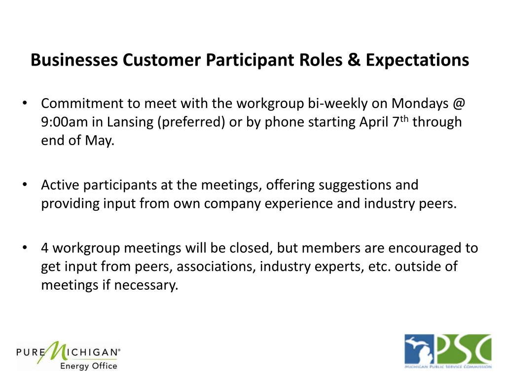 Businesses Customer Participant Roles & Expectations • Commitment to meet with the workgroup bi-weekly on Mondays @ 9:00am in Lansing (preferred) or by phone starting April 7th through end of May. • Active participants at the meetings, offering suggestions and providing input from own company experience and industry peers. • 4 workgroup meetings will be closed, but members are encouraged to get input from peers, associations, industry experts, etc. outside of meetings if necessary.