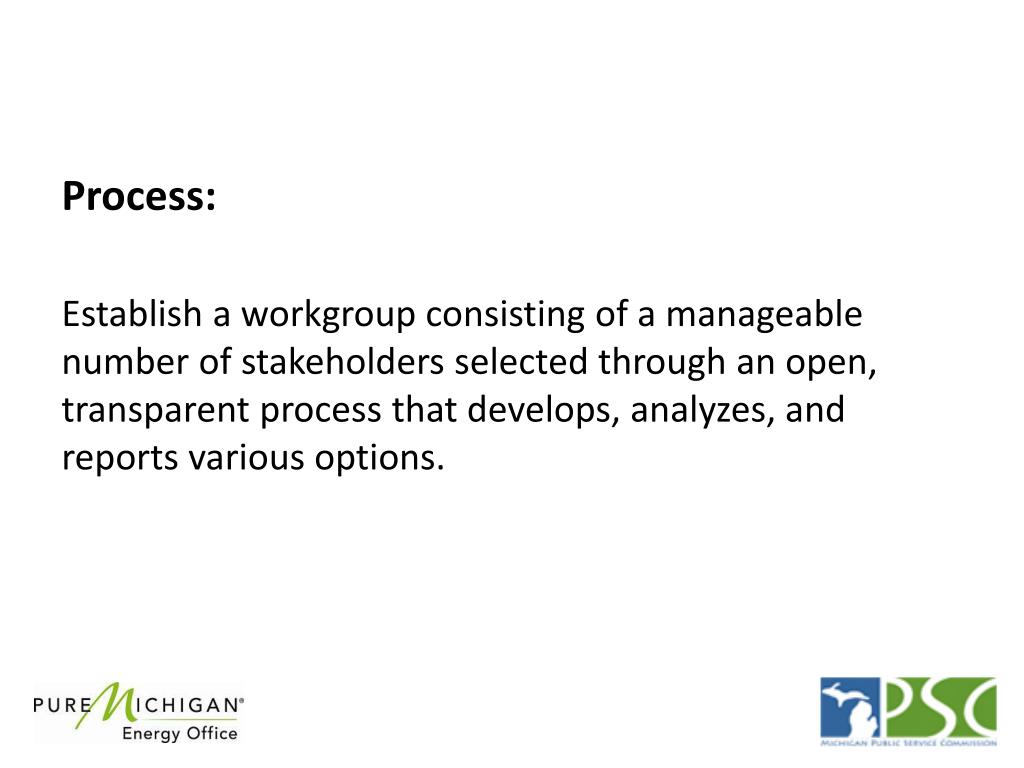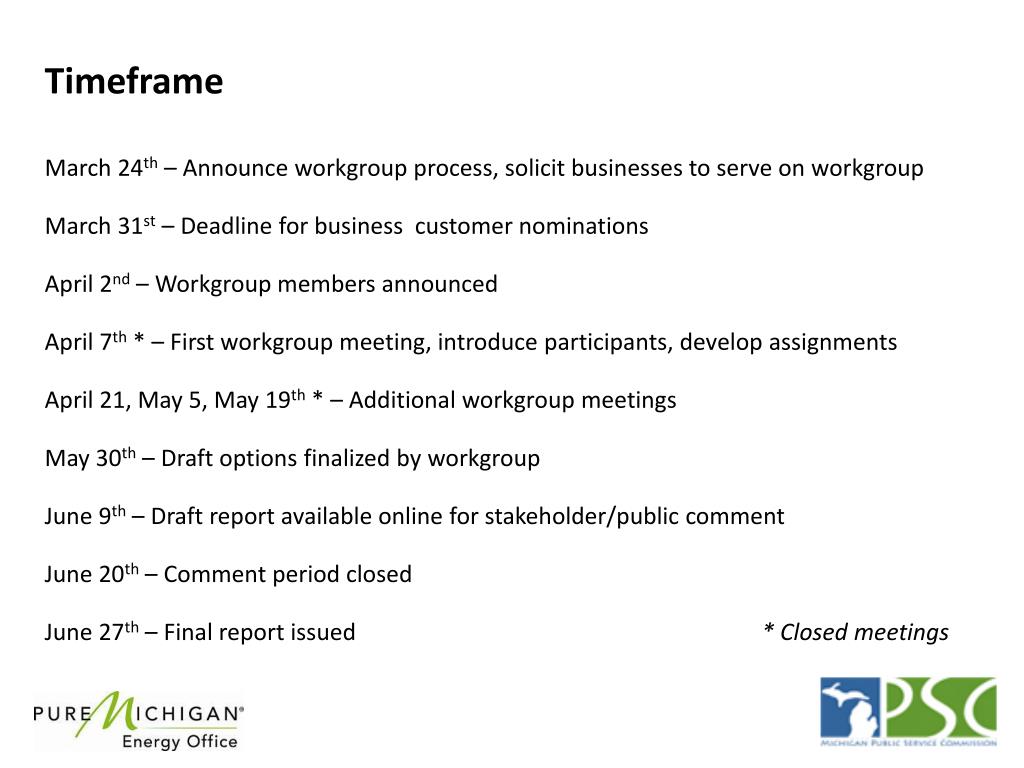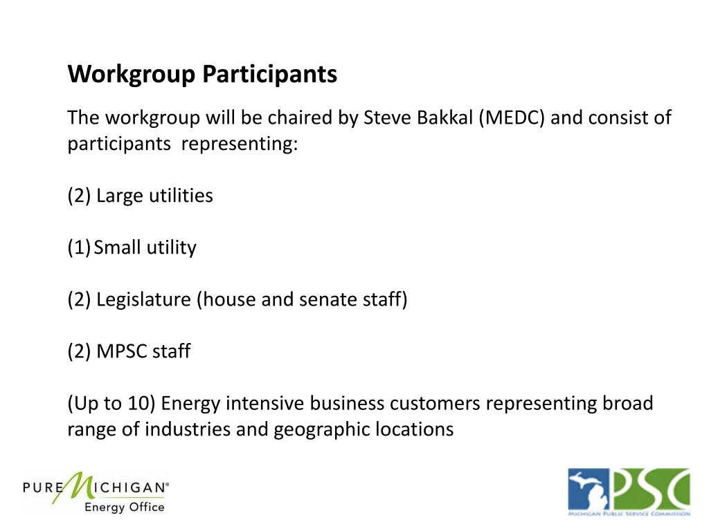 Workgroup Participants • The workgroup will be chaired by Steve Bakkal (MEDC) and consist of participants representing: • (2) Large utilities • Small utility • (2) Legislature (house and senate staff) • (2) MPSC staff • (Up to 10) Energy intensive business customersrepresenting broad range of industries and geographic locations