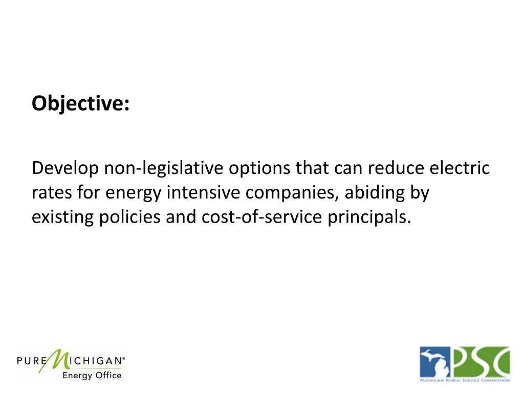 Objective: Develop non-legislative options that can reduce electric rates for energy intensive companies, abiding by existing policies and cost-of-service principals.