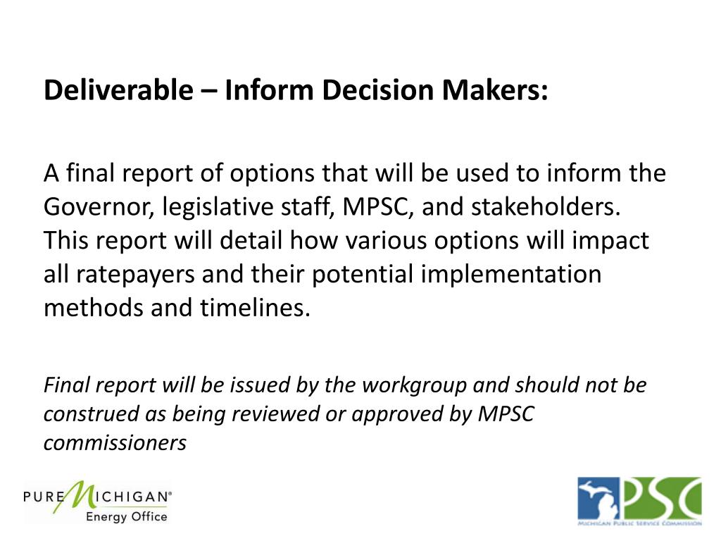 Deliverable – Inform Decision Makers: A final report of options that will be used to inform the Governor, legislative staff, MPSC, and stakeholders. This report will detail how various options will impact all ratepayers and their potential implementation methods and timelines. Final report will be issued by the workgroup and should not be construed as being reviewed or approved by MPSC commissioners