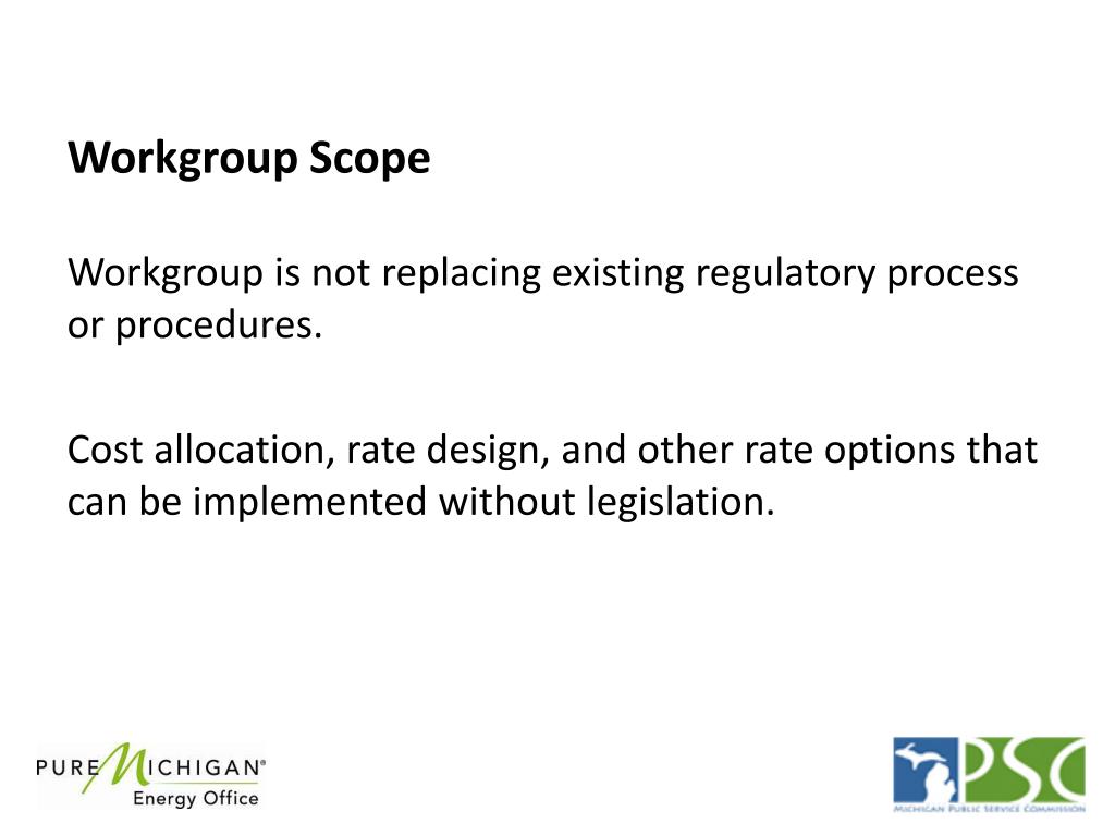 Workgroup Scope Workgroup is not replacing existing regulatory process or procedures. Cost allocation, rate design, and other rate options that can be implemented without legislation.