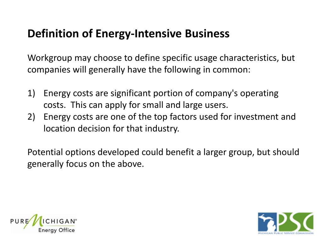 Definition of Energy-Intensive Business Workgroup may choose to define specific usage characteristics, but companies will generally have the following in common: Energy costs are significant portion of company's operating costs. This can apply for small and large users. Energy costs are one of the top factors used for investment and location decision for that industry. Potential options developed could benefit a larger group, but should generally focus on the above.