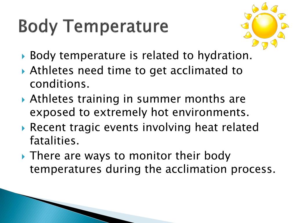 Body Temperature • Body temperature is related to hydration. • Athletes need time to get acclimated to conditions. • Athletes training in summer months are exposed to extremely hot environments. • Recent tragic events involving heat related fatalities. • There are ways to monitor their body temperatures during the acclimation process.