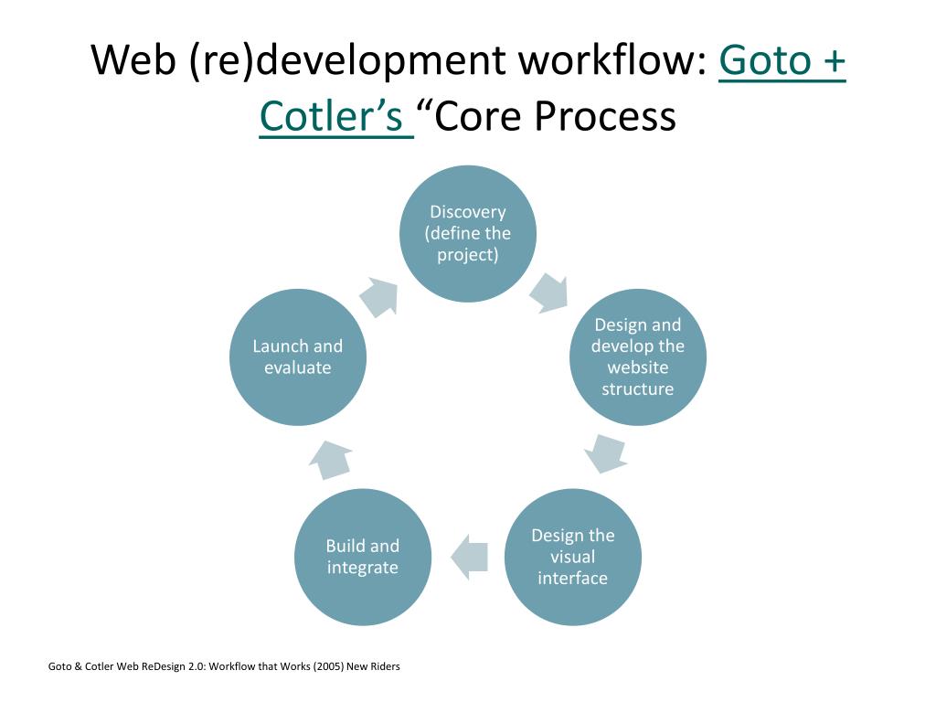 Web (re)development workflow: Goto + Cotler’s“Core Process Goto & Cotler Web ReDesign 2.0: Workflow that Works (2005) New Riders