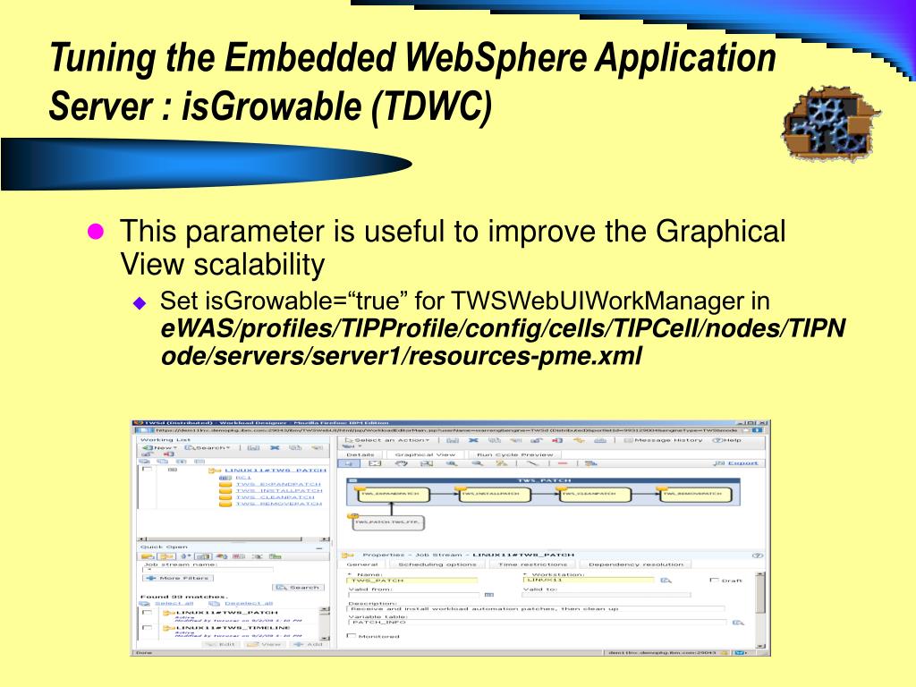 Tuning the Embedded WebSphere Application Server : isGrowable (TDWC) • This parameter is useful to improve the Graphical View scalability • Set isGrowable=“true” for TWSWebUIWorkManager in eWAS/profiles/TIPProfile/config/cells/TIPCell/nodes/TIPNode/servers/server1/resources-pme.xml