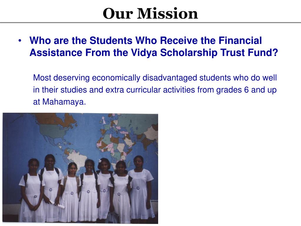 Our Mission • Who are the Students Who Receive the Financial Assistance From the Vidya Scholarship Trust Fund? • Most deserving economically disadvantaged students who do well • in their studies and extra curricular activities from grades 6 and up • at Mahamaya.