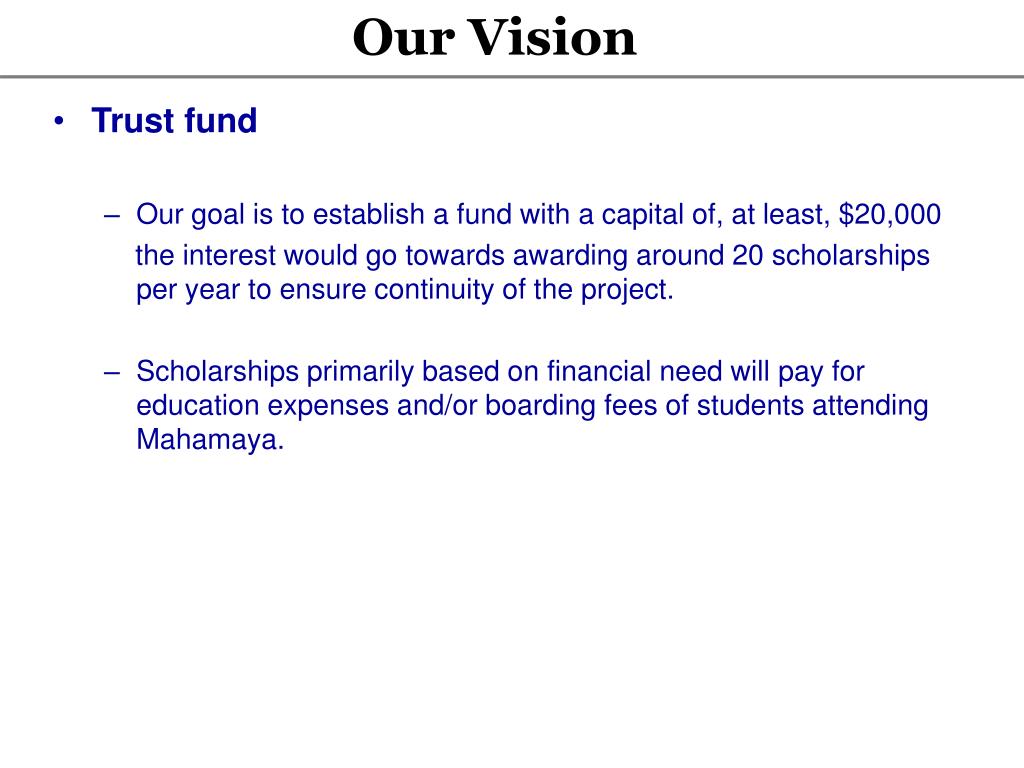 Our Vision • Trust fund • Our goal is to establish a fund with a capital of, at least, $20,000 • the interest would go towards awarding around 20 scholarships per year to ensure continuity of the project. • Scholarships primarily based on financial need will pay for education expenses and/or boarding fees of students attending Mahamaya.