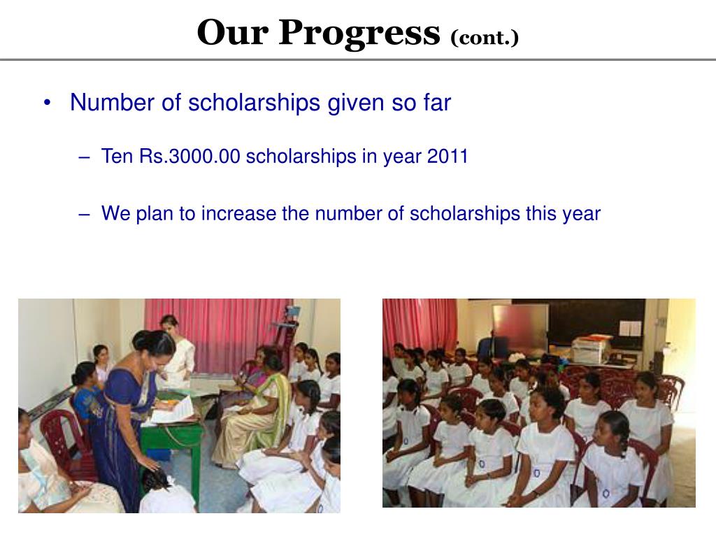 Our Progress (cont.) • Number of scholarships given so far • Ten Rs.3000.00 scholarships in year 2011 • We plan to increase the number of scholarships this year