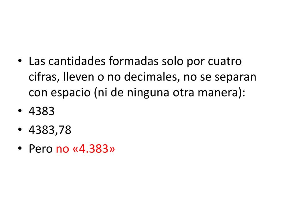 Las cantidades formadas solo por cuatro cifras, lleven o no decimales, no se separan con espacio (ni de ninguna otra manera): • 4383 • 4383,78 • Pero no «4.383»
