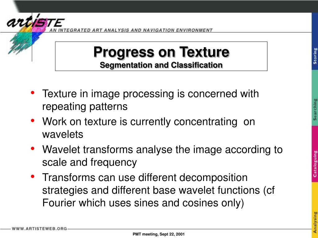 Progress update on texture analysis algorithms and segmentation techniques using wavelets for image processing. Discussions include segmentation for texture indexing, query by low-quality images, multi-nodal signatures, query by sketch, and color clustering.