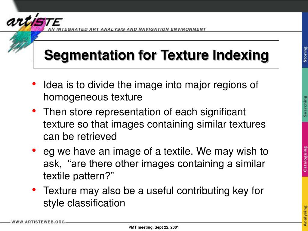 Segmentation for Texture Indexing • Idea is to divide the image into major regions of homogeneous texture • Then store representation of each significant texture so that images containing similar textures can be retrieved • eg we have an image of a textile. We may wish to ask, “are there other images containing a similar textile pattern?” • Texture may also be a useful contributing key for style classification PMT meeting, Sept 22, 2001