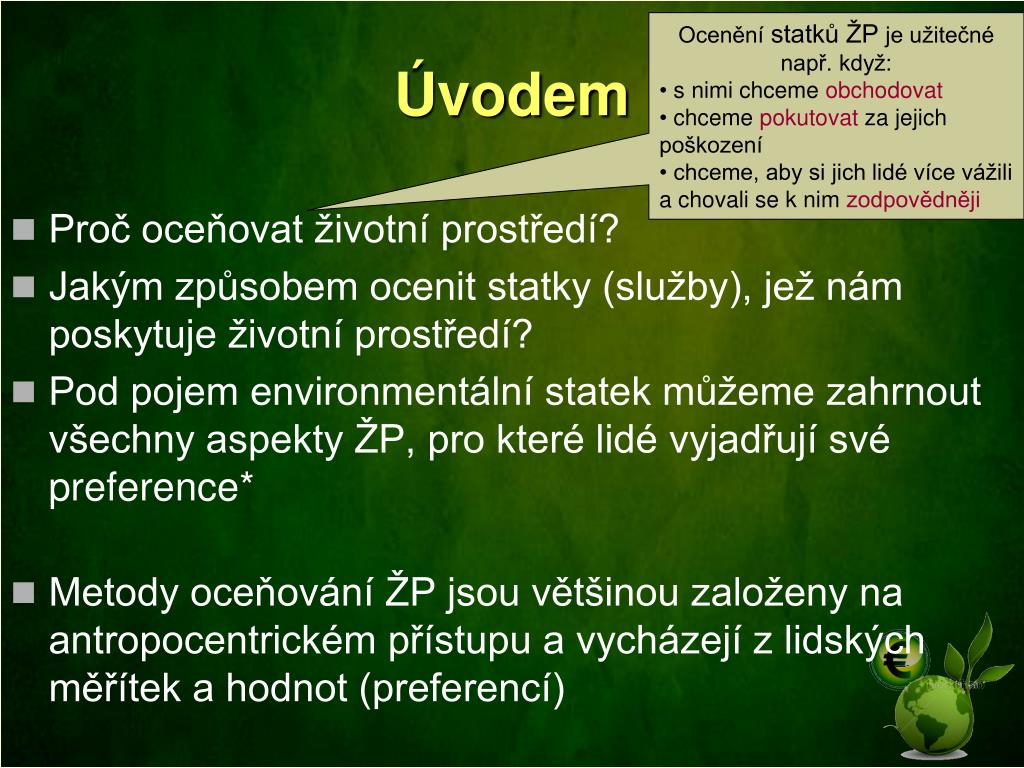 Ocenění statků ŽP je užitečné např. když: • s nimi chceme obchodovat • chceme pokutovat za jejich poškození • chceme, aby si jich lidé více vážili a chovali se k nim zodpovědněji Úvodem • Proč oceňovat životní prostředí? • Jakým způsobem ocenit statky (služby), jež nám poskytuje životní prostředí? • Pod pojem environmentální statek můžeme zahrnout všechny aspekty ŽP, pro které lidé vyjadřují své preference* • Metody oceňování ŽP jsou většinou založeny na antropocentrickém přístupu a vycházejí z lidských měřítek a hodnot (preferencí)