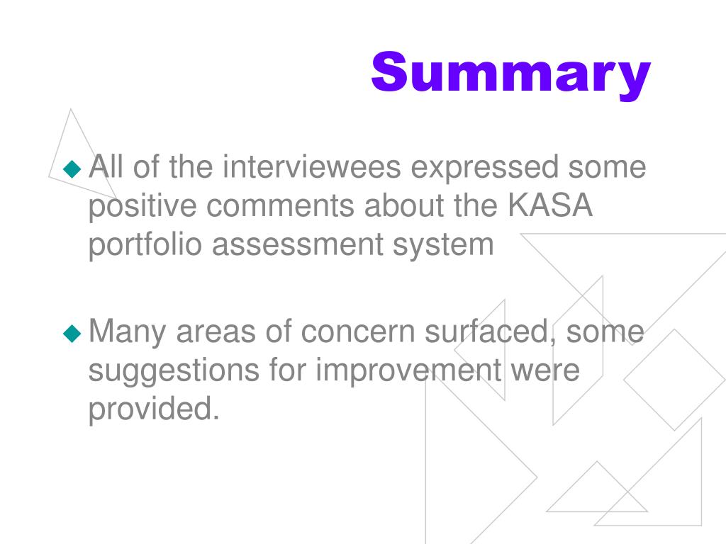 Summary • All of the interviewees expressed some positive comments about the KASA portfolio assessment system • Many areas of concern surfaced, some suggestions for improvement were provided.