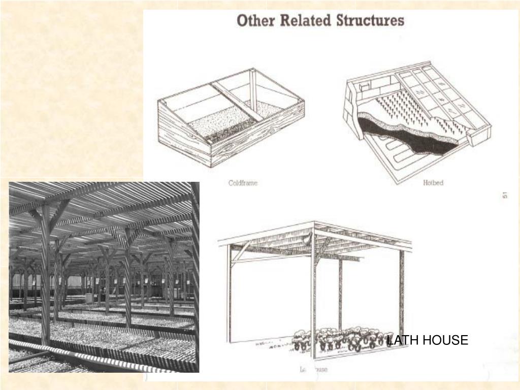 Lath Houses • Made from wood or wood with a metal frame. • Used to provide shade to plants.