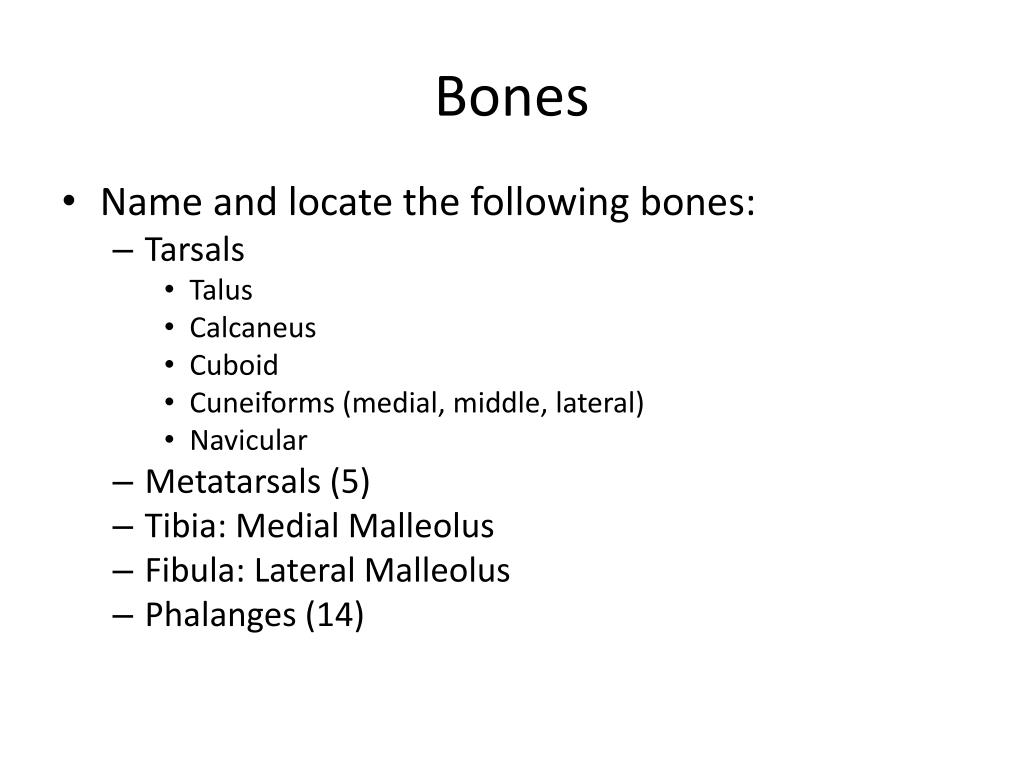 Bones • Name and locate the following bones: • Tarsals • Talus • Calcaneus • Cuboid • Cuneiforms (medial, middle, lateral) • Navicular • Metatarsals (5) • Tibia: Medial Malleolus • Fibula: Lateral Malleolus • Phalanges (14)