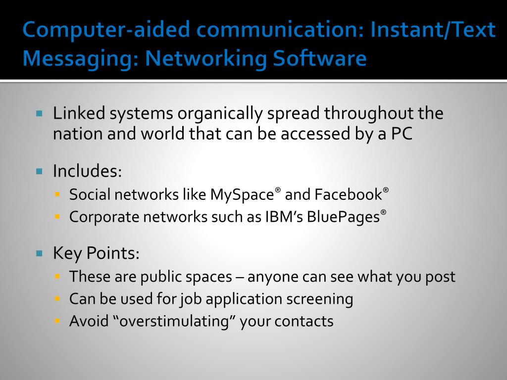 Computer-aided communication: Instant/Text Messaging: Networking Software • Linked systems organically spread throughout the nation and world that can be accessed by a PC • Includes: • Social networks like MySpace® and Facebook® • Corporate networks such as IBM’s BluePages® • Key Points: • These are public spaces – anyone can see what you post • Can be used for job application screening • Avoid “overstimulating” your contacts